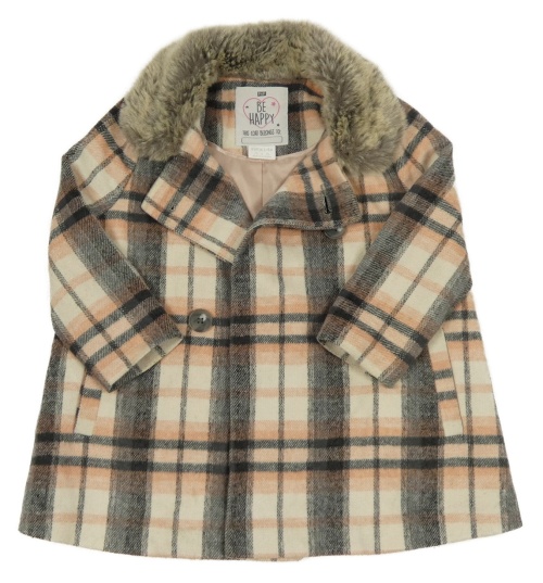 Růžovo-šedo-smetanový kostkovaný vlněný podšitý kabát s kožíškem F&F