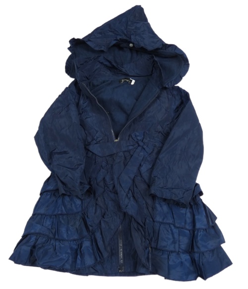 Tmavomodrý šusťákový zateplený kabát s mašlí a kapucí