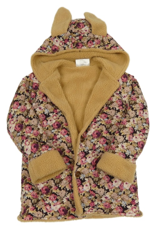 Hnědo-růžový květovaný plátěný zateplený kabát s kapucí s ušima