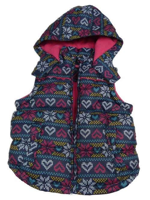 Tmavomodro-barevná vzorovaná šusťáková zateplená vesta s vločkami a srdíčky a kapucí YD