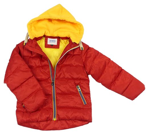 Červeno-žlutá šusťáková prošívaná zimní bunda s kapucí