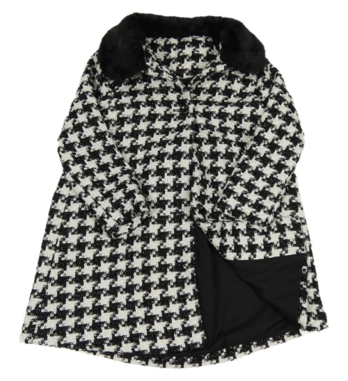 Bílo-černý vzorovaný pletený podšitý kabát s chlupatým límcem St. Bernard