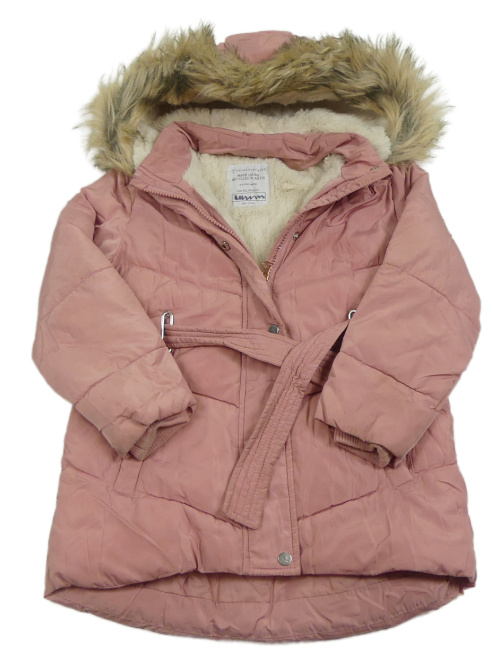 Růžový prošívaný šusťákový zimní kabát s odepínací kapucí s kožešinou a páskem PRIMARK