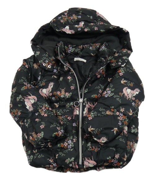 Černá květinová šusťáková zimní bunda s jednorožci a kapucí H&M