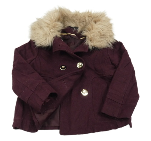 Vínový vlněný podšitý kabát s kožešinou