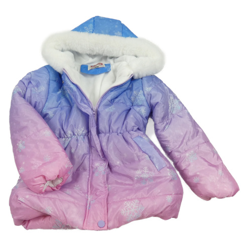 Modro-fialovo-růžová prošívaná šusťáková zimní parka s vločkami a kapucí s kožešinou