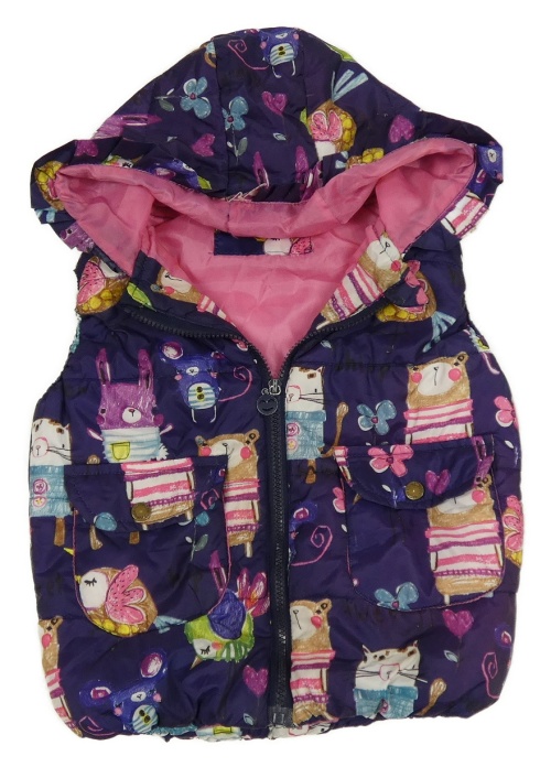 Tmavofialová šusťáková zateplená vesta se zvířaty a kapucí