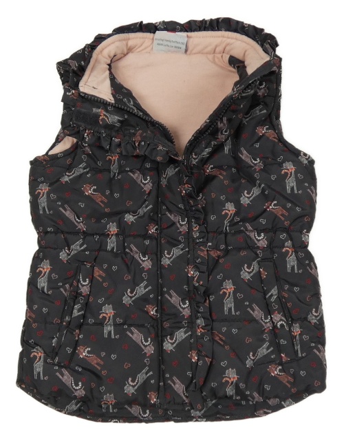 Černošedá prošívaná šusťáková zateplená vesta s kočičkami a srdíčky a volánky Topolino