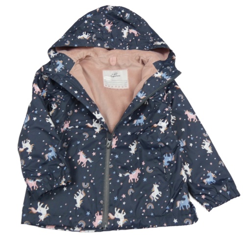 Tmavomodrá šusťáková jarní bunda s jednorožci a kapucí Topolino