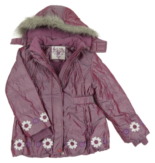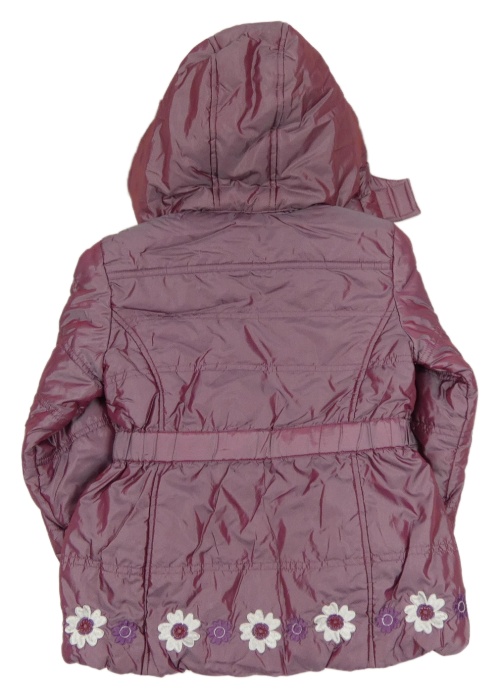 Vínovo/fialová metalická šusťáková zimní parka s květy a odepínací kapucí s kožešinou C&A