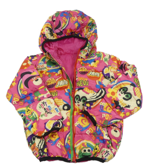 Růžovo-barevná šusťáková zimní bunda s obrázky a kapucí