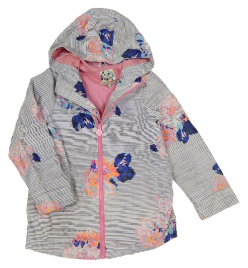 Bílo-námořnicky modrá pruhovaná nepromokavá jarní bunda s květy a kapucí joules