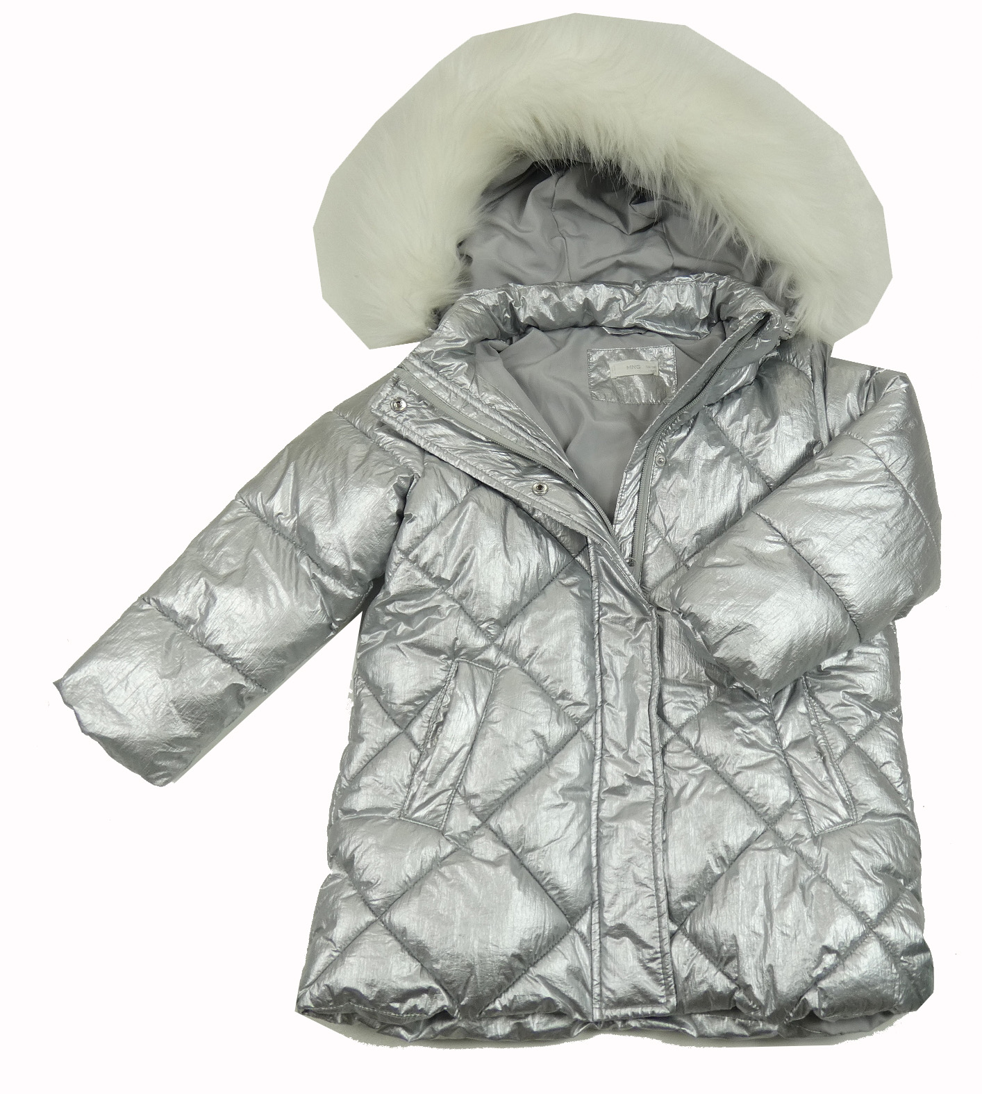Stříbrná šusťáková zimní bunda s kapucí s kožešinou Mango