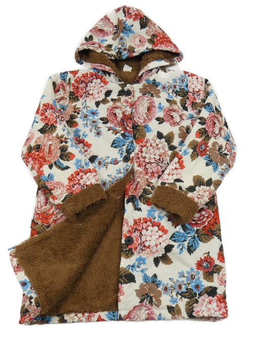 Smetanovo-hnědý šusťákový zateplený kabát s růžemi a kapucí SHEIN