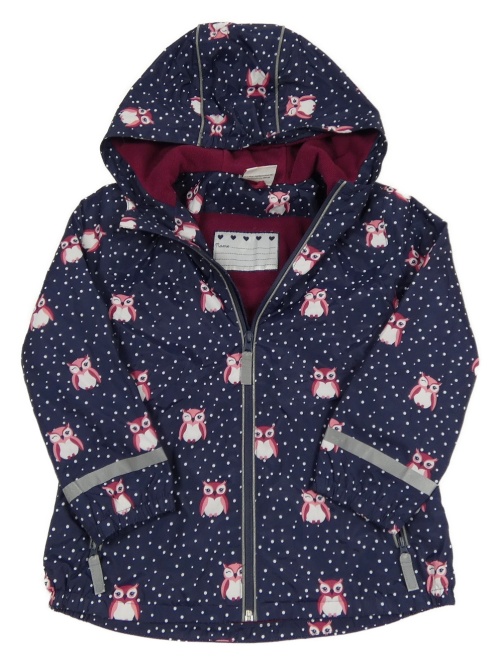Tmavomodrá puntíkatá šusťáková jarní bunda se sovičkami a kapucí Topolino