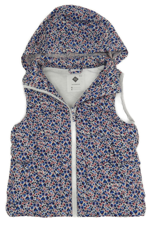 Bílo-modro-červená květovaná šusťáková zateplená vesta s kapucí
