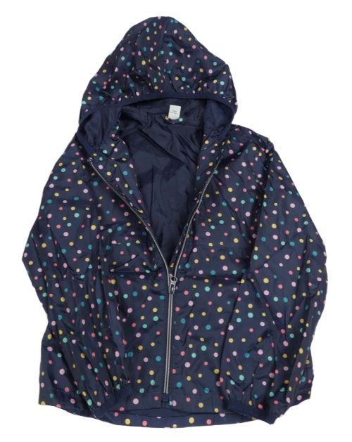 Tmavomodrá šusťáková podzimní bunda s barevnými puntíky a kapucí Tu