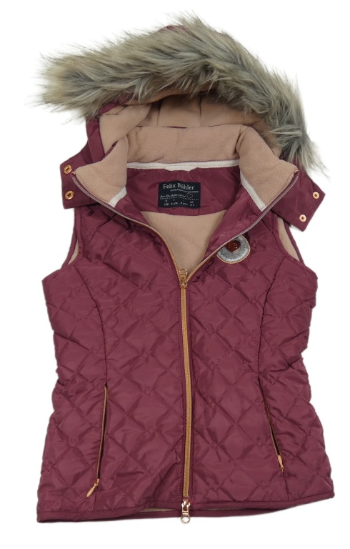 Vínová šusťáková prošívaná zateplená vesta s nášivkou a kapucí s kožešinou