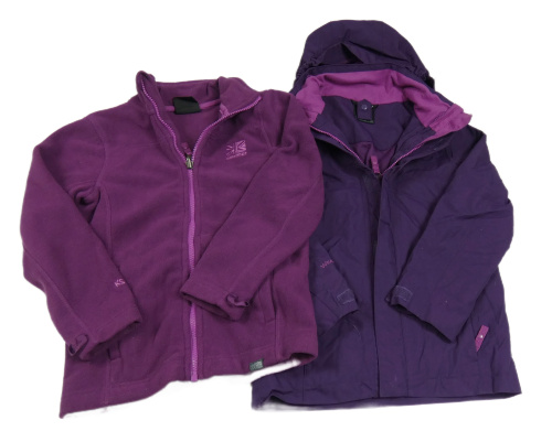 3v1set - Fialová šusťáková jarní funkční bunda s kapucí + vínová fleecová propínací mikina Karrimor