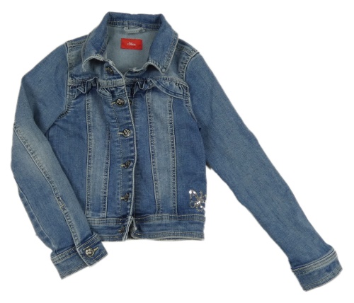 Modrá tepláková riflová crop bunda s motýlkem z flitrů a volánky S. Oliver