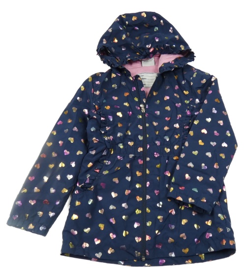 Tmavomodrá šusťáková jarní parka se srdíčky a volánky a kapucí Topolino