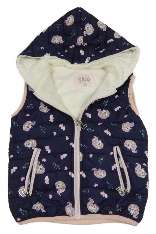 Tmavomodrá prošívaná šusťáková zateplená vesta s pony a srdíčky a kapucí S&D