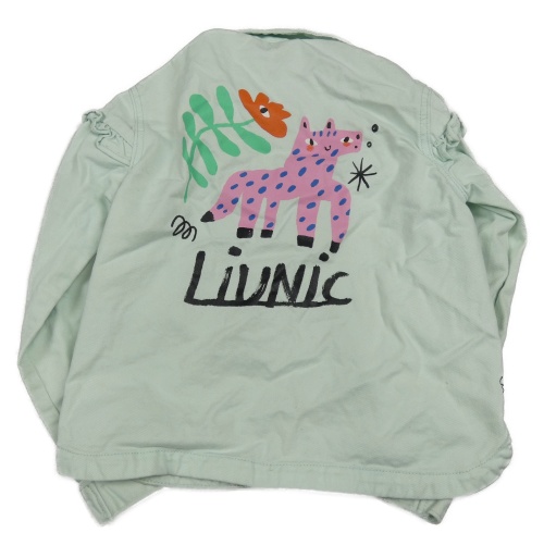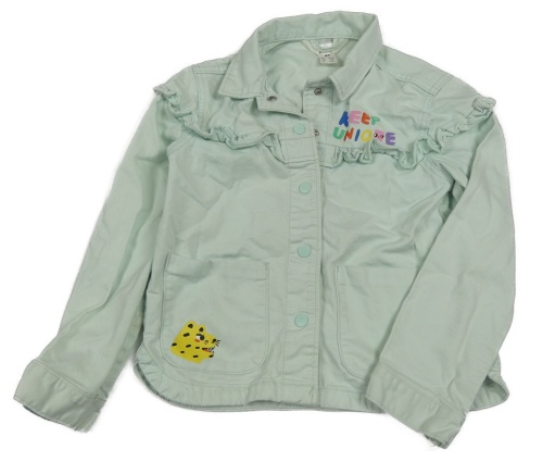 Mátová riflová bunda s nápisy a zvířátky a volánky H&M