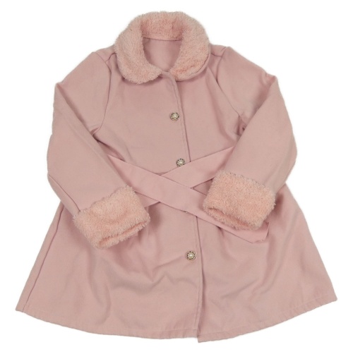 Světlerůžový flaušový kabát s límečkem a kožešinou a páskem