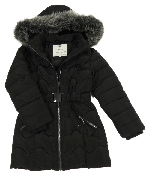 Černý prošívaný šusťákový zimní kabát s páskem a kapucí Primark