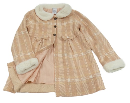 • Pudrovo-bílo-okrový kostkovaný vzorovaný podšitý kabát s mašlemi a kožešinou a límečkem TAHARI