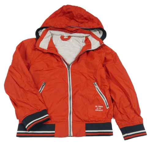 Červeno-tmavomodrý šusťákový jarní bomber s nápisy a pruhy a odepínací kapucí H&M