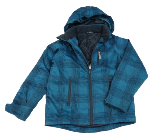 • Petrolejovo-černá kostkovaná šusťáková přechodová bunda s odepínací kapucí KIDS