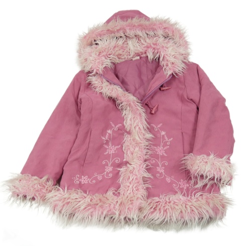 Růžový semišový zateplený kabát s kytičkami a srdíčky a kožešinou a odepínací kapucí myc