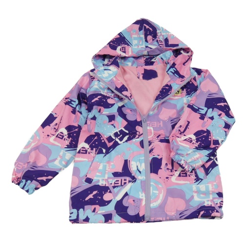 Růžovo-fialovo-světlemodrá vzorovaná šusťáková zateplená bunda s kapucí