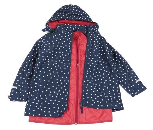3v1 - Tmavomodrá puntíkatá šusťáková jarní bunda s odepínací kapucí + malinová prošívaná šusťáková zateplená vesta TCM