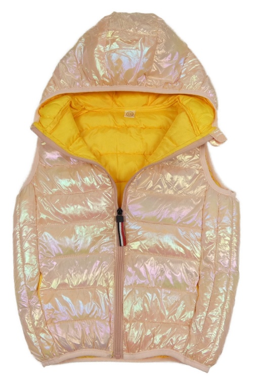 Světlerůžová metalická šusťáková zateplená vesta s kapucí