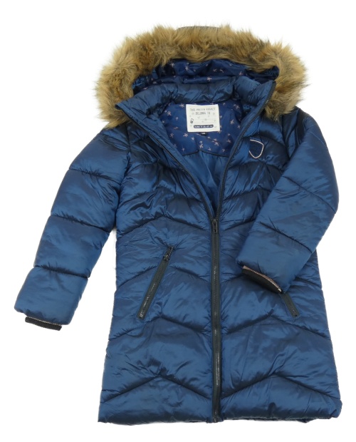 Tmavomodrý šusťákový zimní kabát s nášivkou a kapucí s kožešinou C&A