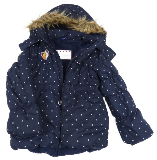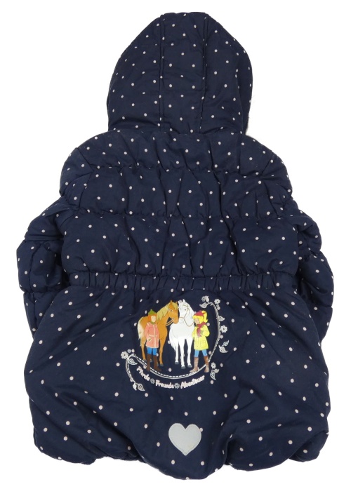 Tmavomodro-růžová puntíkatá šusťáková zimní bunda s koníky a kapucí s kožešinou