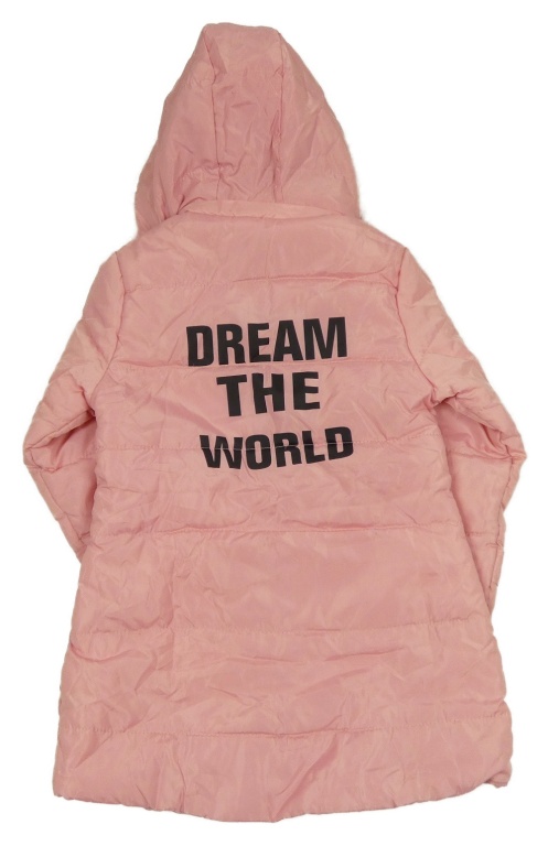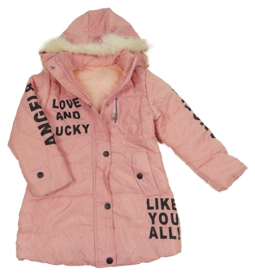 Růžový prošívaný šusťákový zimní kabát s nápisy a odepínací kapucí s kožešinou
