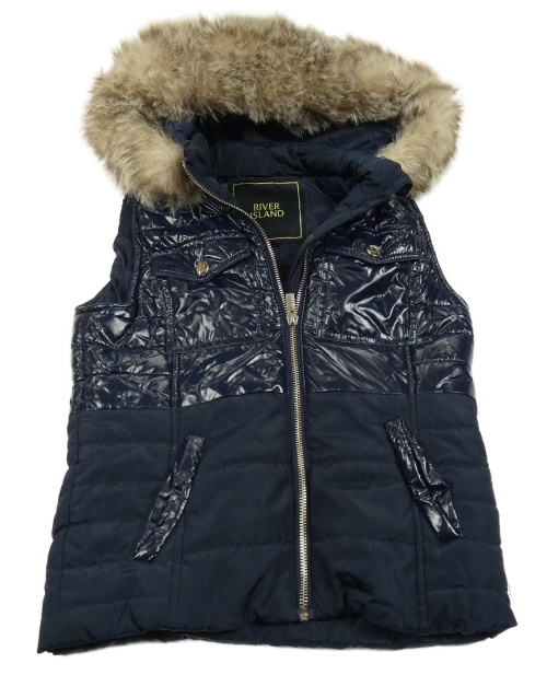 Tmavomodrá šusťákovo/koženková zateplená vesta s kapucí s kožešinou River Island