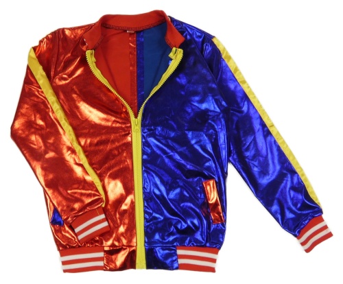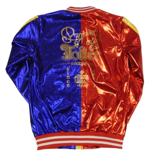 Červeno-safírový metalický saténový bomber s pruhy a nápisy