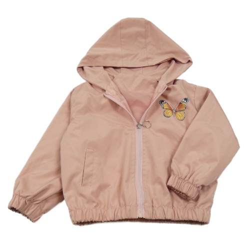 Světlerůžová šusťáková jarní bunda s kapucí s motýlem