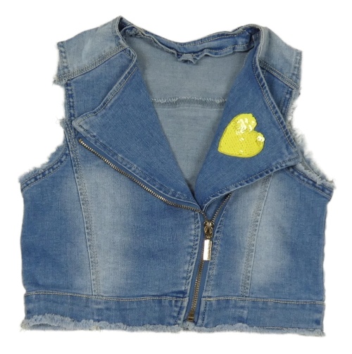 Modrá riflová crop vesta se srdcem z překlápěcích flitrů