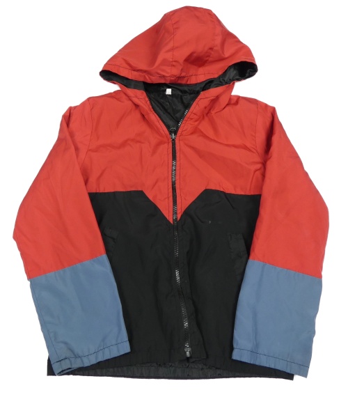 Červeno-černo-modrá šusťáková jarní bunda s kapucí