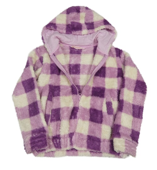 Fialovo-bílá kostkovaná chlupatá bunda s kapucí
