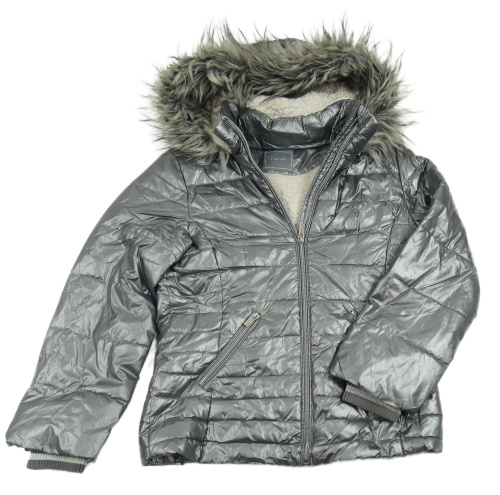 Šedá lesklá šusťáková zimní bunda s kapucí s kožešinou Next