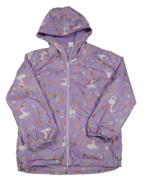 Fialová šusťáková jarní bunda s jednorožci a kapucí