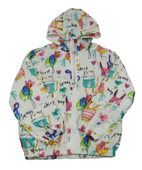 Bílo-barevná šusťáková jarní bunda s obrázky a kapucí