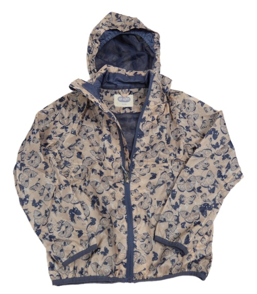 Pudrovo-tmavomodrá šusťáková podzimní bunda s motýlky a ukrývací kapucí HIP&HOPPS
