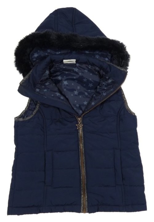Tmavomodrá šusťáková zateplená vesta s kapucí s kožešinou Yigga